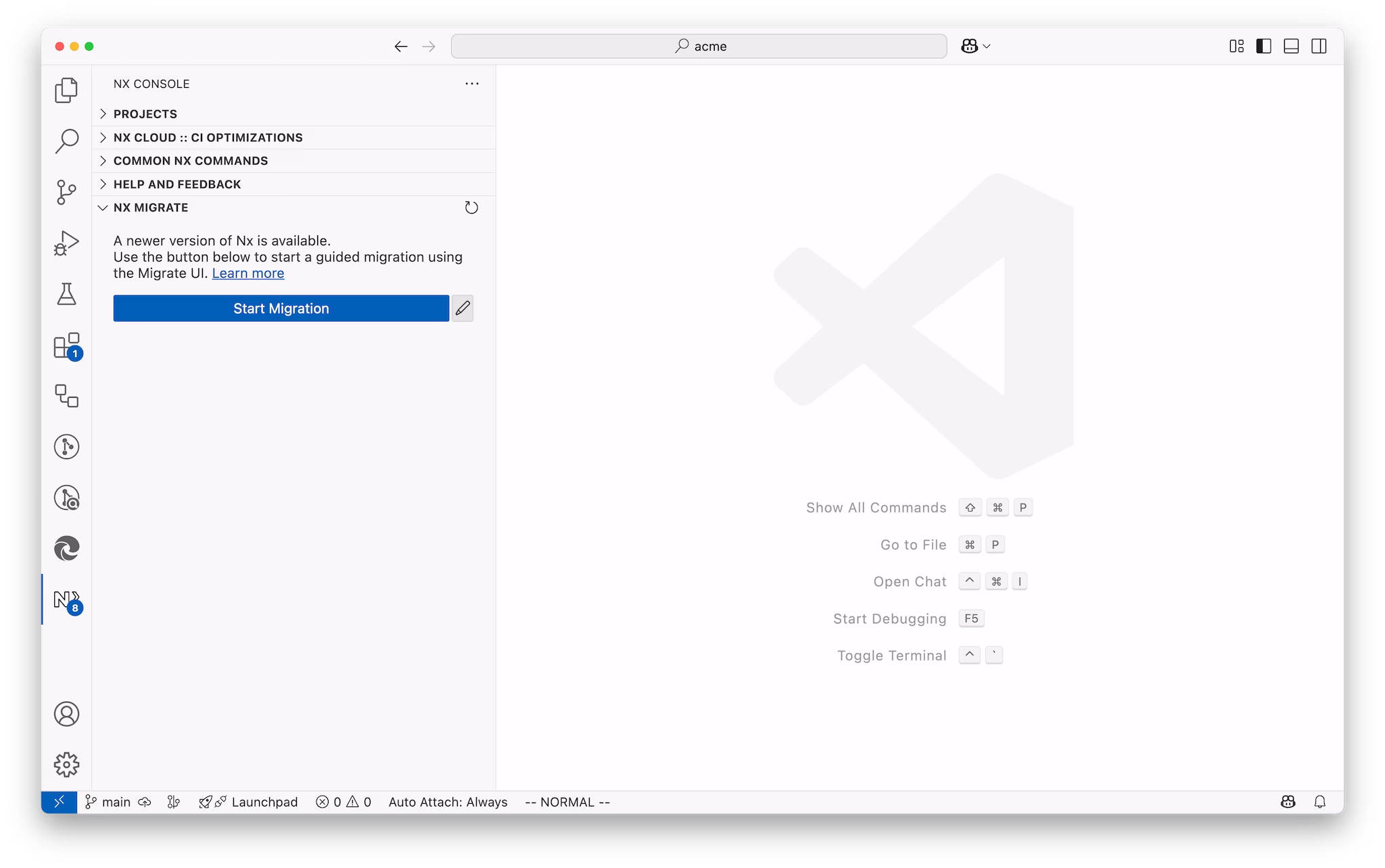When an update to Nx is available, a badge will appear on the Nx Console icon in your Activity Bar. Bring up the Nx Console view (Hint: type in > Show Nx Console